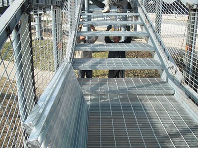 樓梯鋼格闆是由鋼格闆加工而成的(鋼格闆是用扁鋼按照一定的間距和橫杆進行交叉排列 ,並(bìng)且焊接成中間帶有方形格子的一種鋼鐵制品)。該産(chǎn)品表面一般用熱鍍鋅、電鍍鋅處理。